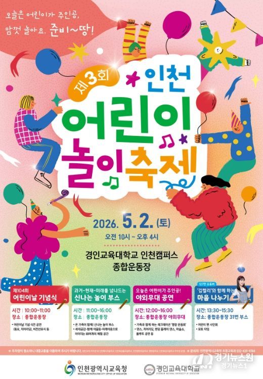 [경기뉴스원/경기뉴스1] | 인천광역시교육청은 5월 2일 경인교육대학교 인천캠퍼스에서 유·초등학생과 가족이 함께하는 ‘제3회 인천 어린이 놀이 축제’를 개최한다.