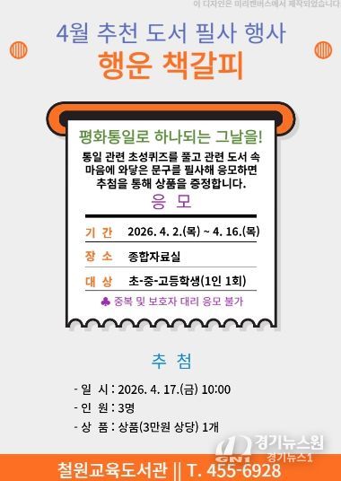 [경기뉴스원/경기뉴스1] | 철원교육도서관(관장 김민서)은 4월부터 11월까지 종합자료실에서 지역 초·중·고 학생을 대상으로 추천 도서 필사 행사 ‘행운 책갈피’를 8회 운영한다.