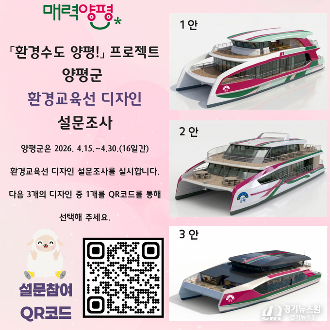 [경기뉴스원/경기뉴스1] | 양평군은 4월 15일부터 30일까지 환경교육선 디자인 선정을 위한 군민 설문조사를 실시한다고 밝혔다. 이번 설문조사는 ‘환경수도 양평! 프로젝트’의 일환으로 추진되는 환경교육선의 디자인을 군민 의견을 반영해 결정하기 위해 마련됐다.