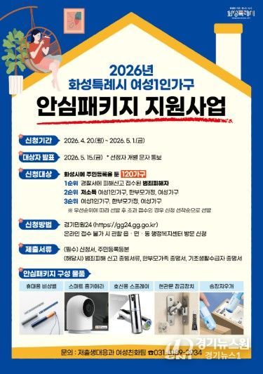 [경기뉴스원/경기뉴스1] | 화성특례시는 범죄 대응에 취약한 여성 1인가구 등 사회적 약자의 안전한 생활을 지원하기 위해 ‘2026년 여성1인가구 안심패키지 지원사업’을 추진하고 대상자를 모집한다고 밝혔다.