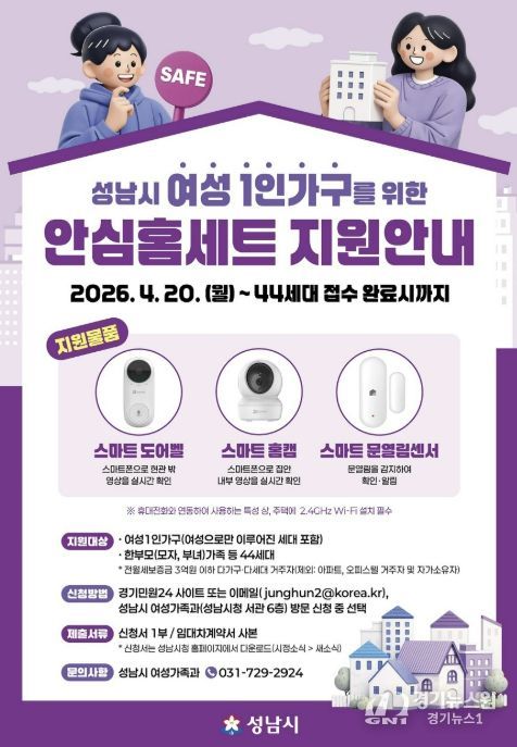 [경기뉴스원/경기뉴스1] | 성남시는 여성 1인 가구의 범죄예방과 안전한 주거생활을 위해 ‘안심 홈세트 3종’을 지원한다고 16일 밝혔다.