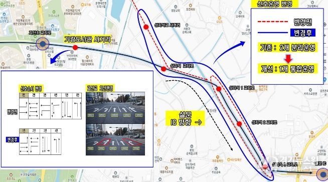 아울러 상지석 교차로부터 설문나들목(IC) 구간까지는 기존 2개로 운영되던 신호 연동체계를 1개 그룹으로 통합하여 출근시간에는 나들목(IC) 방향, 퇴근시간에는 신도시 방향 중심으로 교통 흐름이 원활히 유지되도록 최적화할 방침이다.