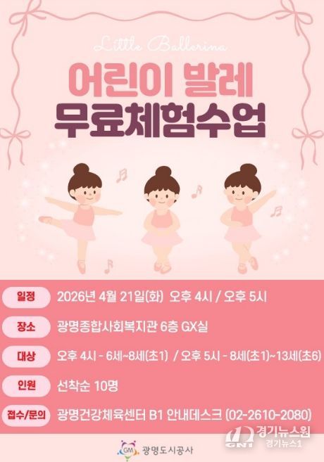 운영 프로그램은 K-POP 댄스와 어린이 발레 2개 종목으로 구성된다. 상세 일정은 ▲어린이 발레 4월 21일 ▲K-POP 댄스 4월 22일이며, 광명종합사회복지관 6층 GX실에서 진행될 예정이다.