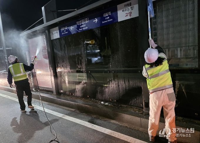 [경기뉴스원/경기뉴스1] | 고양특례시 일산서구는 오는 24일 개최되는 ‘2026고양국제꽃박람회’에 대비해 방문객과 시민들에게 쾌적한 교통 환경을 제공하기 위해 지난 15일 새벽 중앙로 간선급행버스체계(BRT) 승강장에 대한 고압 물세척을 완료했다.