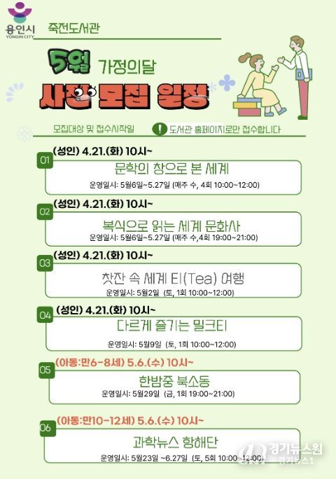 [경기뉴스원/경기뉴스1] | 용인특례시 죽전도서관은 오는 5월 가정의 달을 맞아 ‘2026년 5월 독서문화행사’를 개최한다.