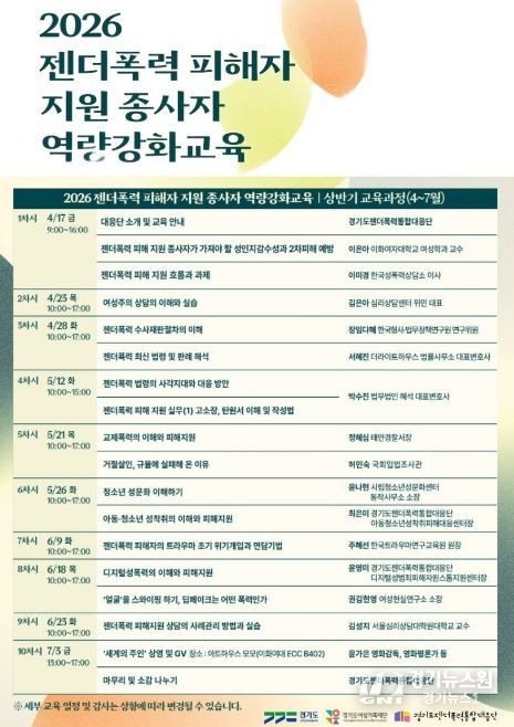 [경기뉴스원/경기뉴스1] | 경기도와 경기도젠더폭력통합대응단이 17일 도내 젠더폭력 피해 지원 현장 종사자들의 전문성 향상을 위한 ‘2026 역량강화 교육’ 상반기 과정을 시작하며 현장 대응력 강화에 나섰다.