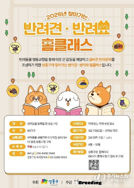 [경기뉴스원/경기뉴스1] | 서울 성동구가 반려동물 문제행동으로 인한 갈등을 해소하고 성숙한 반려문화를 조성하기 위해 ‘찾아가는 반려견·반려묘 홈클래스’를 4월부터 10월까지 운영한다고 밝혔다.