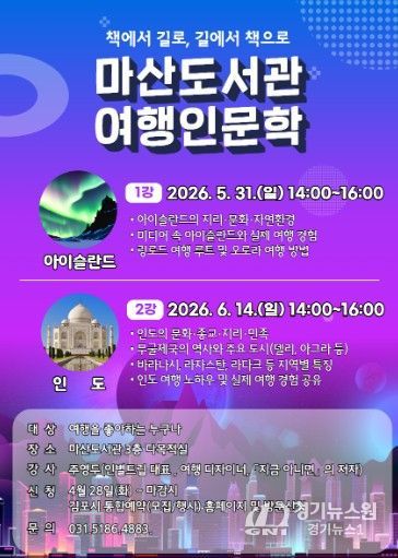 [경기뉴스원/경기뉴스1] | 김포시 마산도서관이 오는 5월 31일과 6월 14일 오후 2시부터 4시까지 다목적실에서 여행 인문학 강연 ‘책에서 길로, 길에서 책으로’를 운영한다.