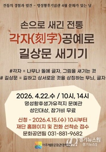 [경기뉴스원/경기뉴스1] | 여주세종문화관광재단은 오는 4월 22일, 명성황후기념관 4월 문화가 있는 날 프로그램으로 '손으로 새긴 전통, 각자(刻字)공예로 길상문 새기기'를 진행한다.
