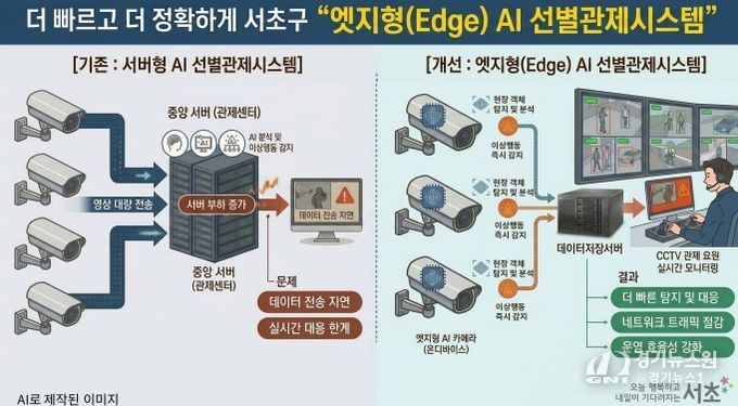 [경기뉴스원/경기뉴스1] | 서울 서초구가 전국 최초로 ‘엣지형 AI 선별관제시스템’을 도입해 본격 운영에 나선다고 밝혔다. AI 카메라가 현장에서 영상을 직접 분석한 뒤 선별된 정보를 관제센터로 전송하는 방식으로, 범죄·재난 등 비상상황 대응 속도와 관제 효율을 높인다는 계획이다.