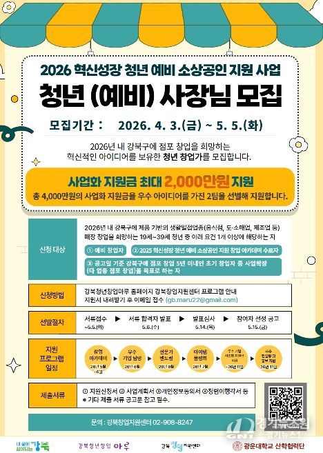 [경기뉴스원/경기뉴스1] | 서울 강북구는 청년 창업 활성화와 지역 상권 경쟁력 강화를 위해 ‘2026년 혁신성장 청년 예비 소상공인 지원사업’ 참여자를 모집한다고 밝혔다.