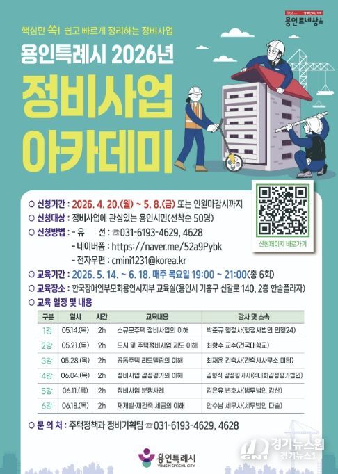 [경기뉴스원/경기뉴스1] | 용인특례시는 4월 20일부터 5월 8일까지 ‘2026년 정비사업 아카데미’ 수강생을 모집한다.