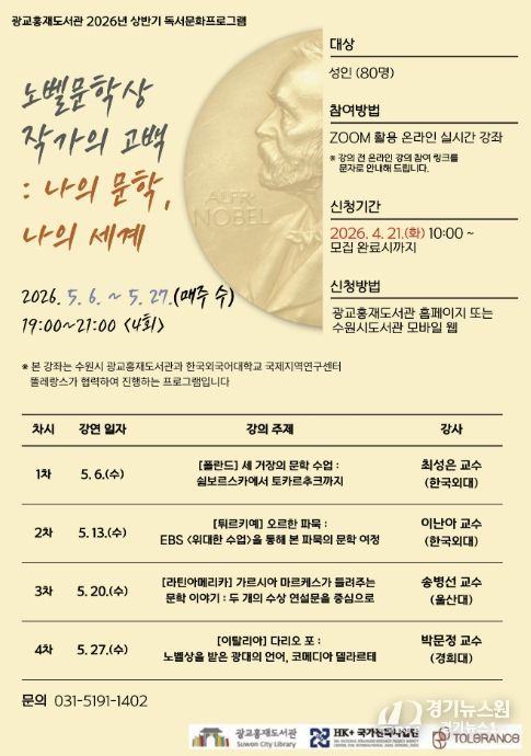 [경기뉴스원/경기뉴스1] | 수원시 광교홍재도서관이 한국외국어대학교와 협력해 진행하는 2026년 세계문화기행 시리즈 1편 ‘노벨문학상 작가의 고백 : 나의 문학, 나의 세계’ 강좌를 수강할 시민을 모집한다.