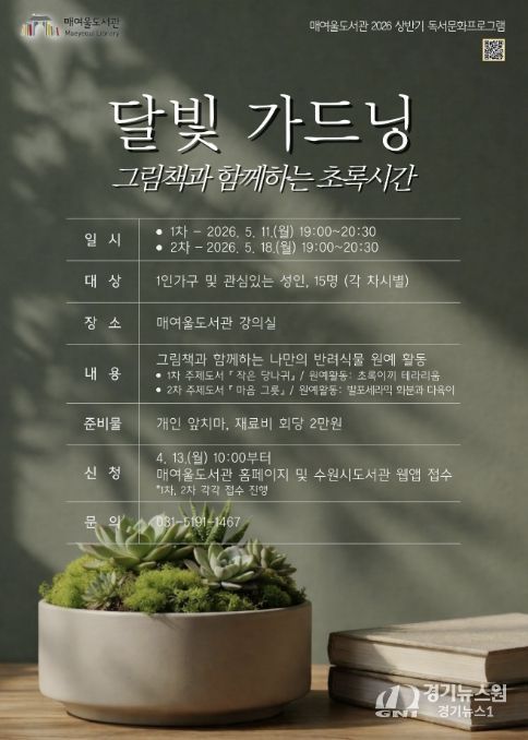 [경기뉴스원/경기뉴스1] | 수원시 매여울도서관이 그림책 읽기와 식물 가드닝을 결합한 체험형 프로그램 ‘달빛 가드닝, 그림책과 함께하는 초록시간’을 운영한다.