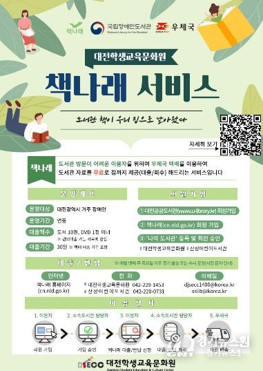 [경기뉴스원/경기뉴스1] | 대전학생교육문화원은 봄철 외부 활동이 어려운 장애인과 65세 이상 어르신 등 독서 소외계층의 책 읽는 즐거움을 위해, 비대면 도서 대출 및 반납 서비스인 ‘책나래’ 사업을 4월부터 본격 추진한다고 밝혔다.