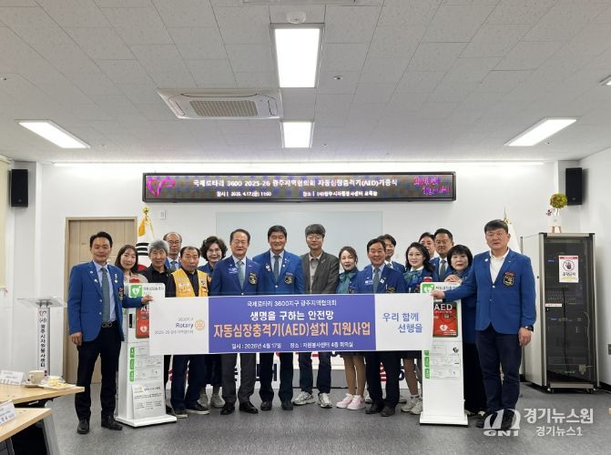 [경기뉴스원/경기뉴스1] | 국제로타리 3600지구 2025-26 광주지역협의회는 지난 17일 광주시자원봉사센터 4층 교육장에서 자동심장충격기 기증식을 개최하고 500만 원 상당의 장비 2대를 전달했다.