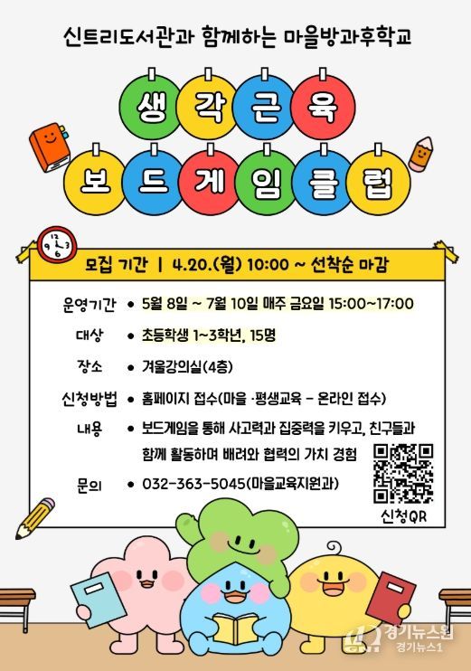[경기뉴스원/경기뉴스1] | 인천광역시교육청신트리도서관은 20일부터 어린이의 인지 발달과 사회성 함양을 위한 ‘생각 근육 보드게임’ 참가자를 모집한다.