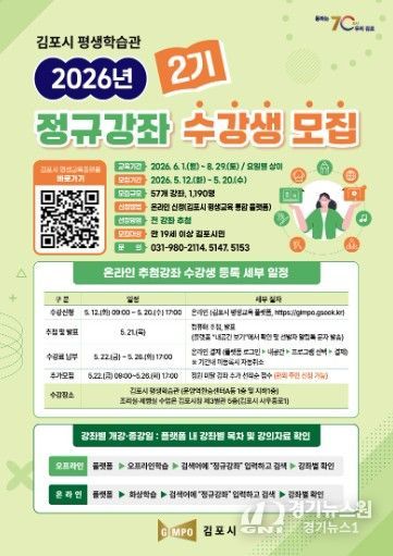 [경기뉴스원/경기뉴스1] | 김포시가 시민의 평생학습 참여 기회를 확대하고 변화하는 사회 환경에 대응할 수 있는 역량 강화를 위해 ‘2026년 2기 평생교육 정규강좌’ 수강생을 모집한다고 밝혔다.
