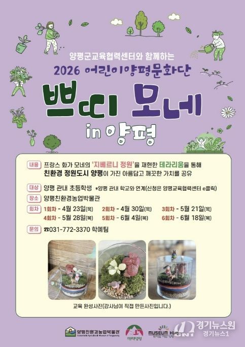 [경기뉴스원/경기뉴스1] | 양평친환경농업박물관은 오는 4월부터 6월까지 양평 관내 초등학생을 대상으로 2026년 교육 프로그램 ‘어린이 양평문화단, 쁘띠 모네 in 양평’을 운영한다고 밝혔다.