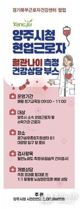 [경기뉴스원/경기뉴스1] | 양주시가 현업근로자의 건강 증진과 뇌심혈관계질환 예방을 위해 오는 4월 22일부터 연말까지 ‘찾아가는 근로자 건강상담 부스’를 운영한다.