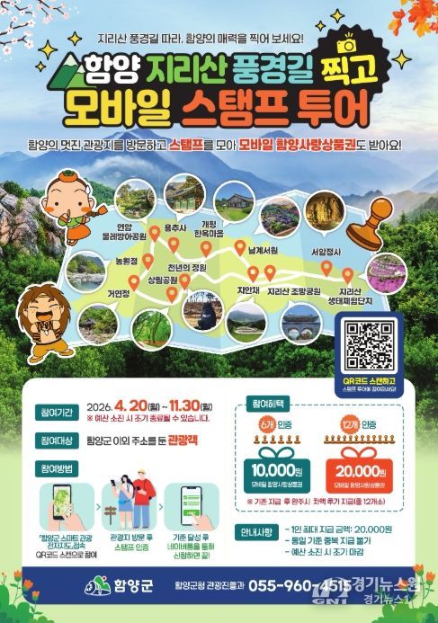 [경기뉴스원/경기뉴스1] | 함양군은 함양의 대표 관광자원을 보다 쉽고 재미있게 즐길 수 있도록, 관광객 참여형 이벤트인 ‘함양 지리산 풍경길 찍고 모바일 스탬프 투어’를 운영한다고 밝혔다.