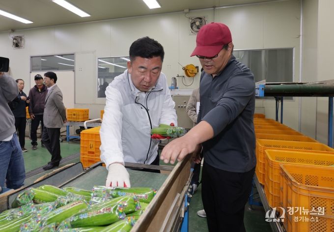 [경기뉴스원/경기뉴스1] | 이범석 청주시장은 20일 흥덕구 오송읍에 위치한 청원생명 애호박 공동선별장을 방문해 공선 및 유통 현황을 점검하고 관계자와 지역 농민들을 격려했다.