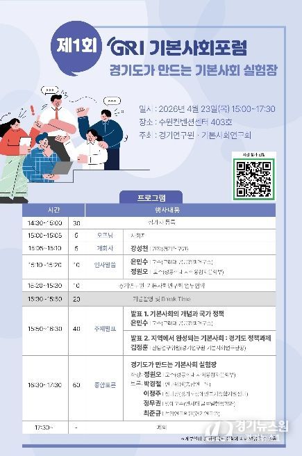 [경기뉴스원/경기뉴스1] | 경기연구원은 오는 23일 오후 3시 수원컨벤션센터 403호에서 ‘경기도가 만드는 기본사회 실험장’을 주제로 ‘제1회 GRI 기본사회포럼’을 개최한다.