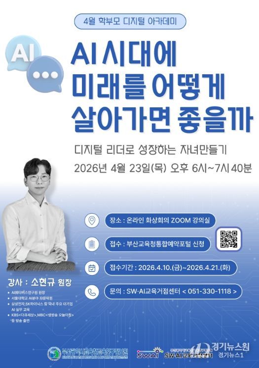 [경기뉴스원/경기뉴스1] | 부산광역시교육청교육연구정보원은 오는 23일 관내 학부모와 시민을 대상으로 온라인(ZOOM)을 통해 4월 학부모 아카데미 ‘AI시대에 미래를 어떻게 살아가면 좋을까?’를 운영한다.