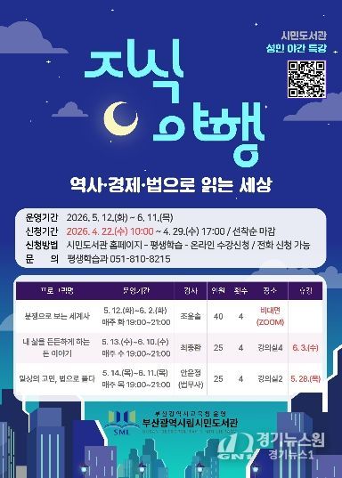 [경기뉴스원/경기뉴스1] | 부산광역시립시민도서관은 오는 5월 12일부터 6월 11일까지 낮 시간 도서관 이용이 어려운 성인 90명을 대상으로 도서관 강의실과 온라인(ZOOM)을 통해 ‘지식 야행’특강을 운영한다.
