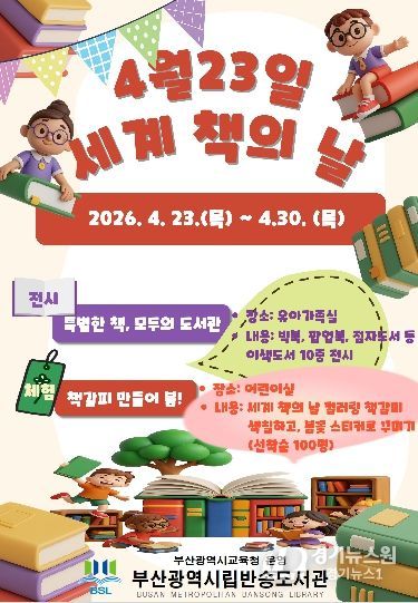 [경기뉴스원/경기뉴스1] | 부산광역시립반송도서관은 세계 책의 날(4월 23일)을 맞아 오는 23일부터 30일까지 도서관 어린이실에서 유아와 초등학생을 대상으로 독서 문화 프로그램을 운영한다.