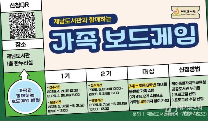 [경기뉴스원/경기뉴스1] | 제주도교육청 제남도서관은 21일 가족이 함께하는 건전한 놀이 문화를 확산하고 도서관 이용을 활성화하기 위해 오는 5월과 6월에 걸쳐 운영되는 ‘가족 보드게임’의 참가자를 모집한다.