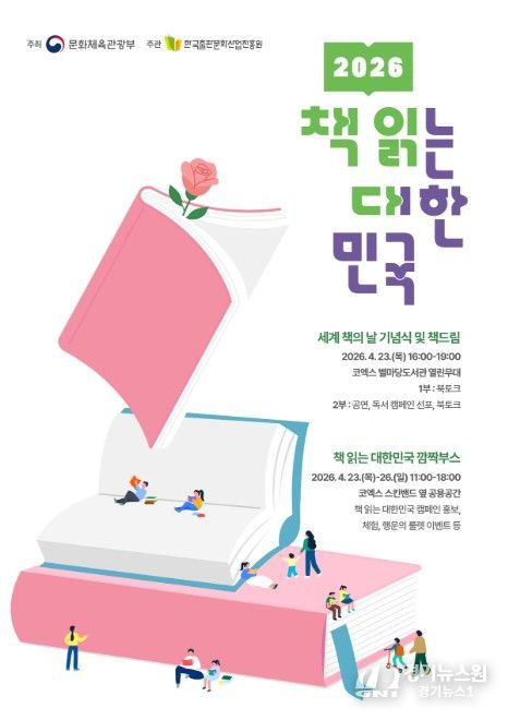 [경기뉴스원/경기뉴스1] | 문화체육관광부는 한국출판문화산업진흥원, (재)책읽는사회문화재단과 함께 4월 23일 오후 4시, 서울 코엑스 별마당도서관에서 대국민 독서 캠페인 ‘2026 책 읽는 대한민국’의 시작을 선포하고 캠페인을 본격적으로 추진한다. ‘책 읽는 대한민국’은 인공지능(AI) 시대에 국민의 생각하는 힘을 기르고, 지역 곳곳에 ‘일상 속 책 읽는 즐거움’을 확산하기 위해 마련한 캠페인이다. 최휘영 장관은 캠페인 선포식을 찾아 ‘책 읽는 즐거움’ 확산에 앞장선다.