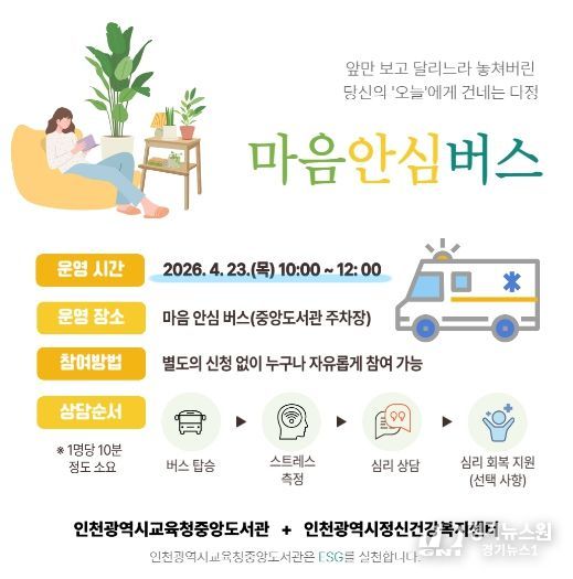 [경기뉴스원/경기뉴스1] | 인천광역시교육청중앙도서관은 오는 23일, 인천정신건강복지센터와 협력하여, 지역 시민들을 위한 찾아가는 마음 돌봄 서비스인 ‘마음안심버스’를 운영한다.