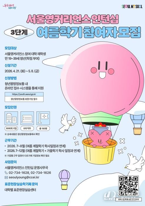 [경기뉴스원/경기뉴스1] | 서울시가 국내 최초로 도입한 초기 청년 대상 단계별 취업 지원책인 ‘서울영커리언스 사업’의 3단계, 인턴십의 여름학기 참여자 150명을 모집한다고 밝혔다.