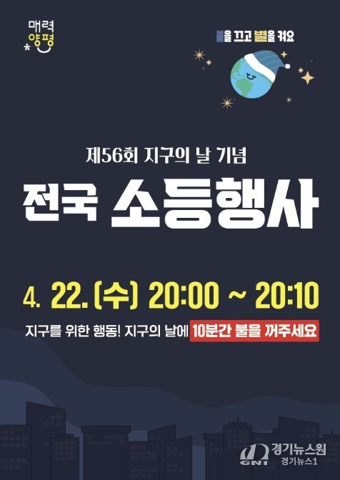 특히 지구의 날 당일인 22일 오후 8시부터 10분간 전 군민이 참여하는 ‘소등 행사’가 진행된다. 양평군청을 비롯한 관내 공공기관은 전면 소등에 참여하고, 공동주택과 일반 가정에서도 자율적으로 동참할 수 있도록 할 계획이다.