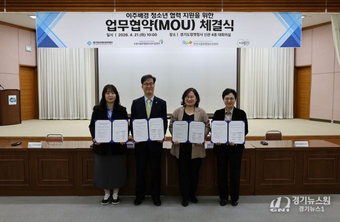 [경기뉴스원/경기뉴스1] | 경기도미래세대재단은 21일 수원시 팔달구 옛 경기도청사에서 수원시글로벌청소년드림센터, 안산시글로벌청소년센터, 화성시글로벌청소년센터와 이주배경 청소년 지원을 위한 업무협약을 체결했다.
