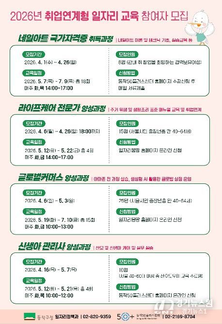 [경기뉴스원/경기뉴스1] | 동작구가 취업을 희망하는 주민의 실무 역량 강화와 현장 진출 지원을 위해 ‘취업연계형 일자리사업’을 확대하고 신규 참여자를 모집한다고 밝혔다.