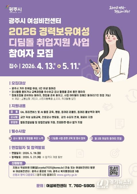 [경기뉴스원/경기뉴스1] | 광주시는 지역 내 경력보유여성의 사회 재진출과 취업 역량 강화를 위해 ‘2026 경력보유여성 디딤돌 취업 지원 사업’ 참여자를 오는 5월 11일까지 모집한다고 22일 밝혔다.
