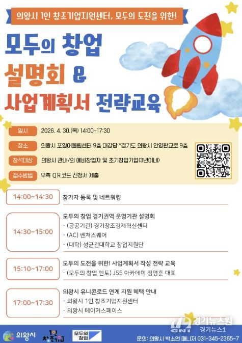 [경기뉴스원/경기뉴스1] | 의왕시 1인 창조기업지원센터는 4월 30일, 창업을 희망하는 예비 및 초기 창업자를 대상으로 ‘모두의 창업’ 설명회 및 전략 교육을 개최한다.