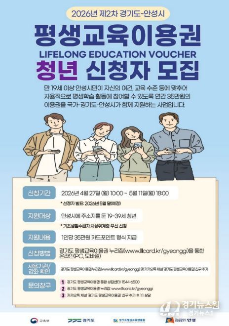 [경기뉴스원/경기뉴스1] | 안성시는 시민의 평생학습 참여 기회를 두텁게 보장하기 위해 오는 4월 27일 오전 10시부터 5월 11일 오후 6시까지 ‘2026년 제2차 경기도-안성시 평생교육이용권’ 지원 대상자를 모집한다고 밝혔다.