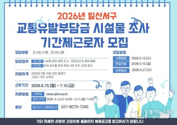 [경기뉴스원/경기뉴스1] | 고양특례시 일산서구는 ‘2026년 교통유발부담금 시설물 전수조사’ 실시를 위해 오는 5월 6일부터 보조원 23명을 모집한다.