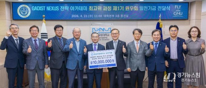 [경기뉴스원/경기뉴스1] | 경상국립대학교는 4월 22일 오전 11시 대학본부 3층 접견실에서 ‘GADIST NEXUS 전략 아카데미 최고위 과정’ 제1기 원우회의 대학발전기금 전달식을 개최했다.