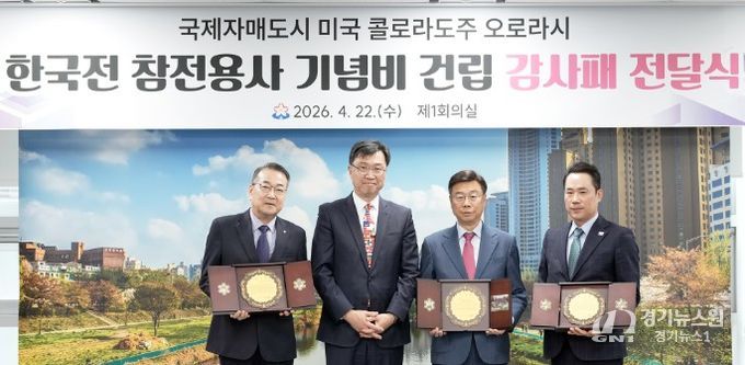 [경기뉴스원/경기뉴스1] | 성남시가 22일 오후 2시 미국 콜로라도주 오로라시의 ‘한국전 참전용사 기념비’ 건립에 기여한 공로를 인정받아 오로라시 한국전참전용사기념비건립위원회로부터 감사패를 받았다.