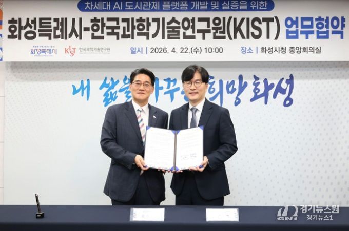 [경기뉴스원/경기뉴스1] | 화성특례시는 도시상태정의 기반의 AI 도시관제 체계로의 전환에 본격 착수했다. 시는 22일 한국과학기술연구원(KIST)과 ‘차세대 AI 도시관제 플랫폼 개발 및 실증’을 위한 업무협약(MOU)을 체결했다.