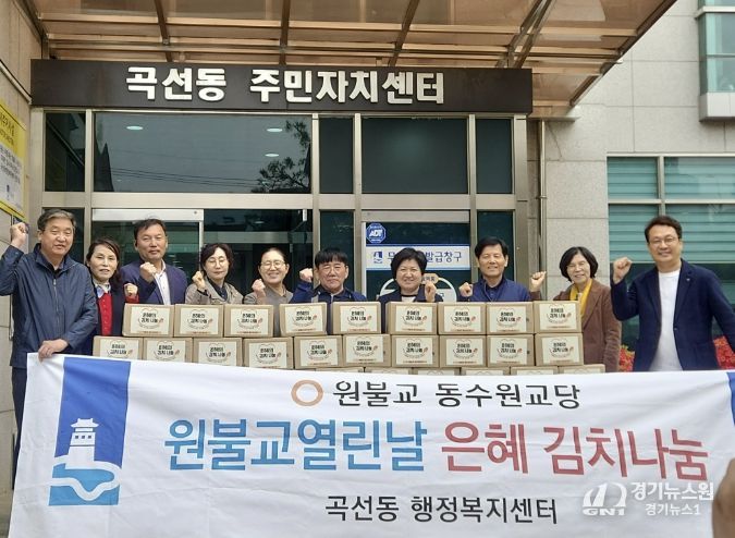 [경기뉴스원/경기뉴스1] | 원불교 동수원교당은 지난 22일 수원시 권선구 곡선동 행정복지센터에서 봄맞이 ‘은혜김치 나눔’ 전달 행사를 개최하고, 정성껏 담근 김치 30박스를 곡선동에 전달했다.