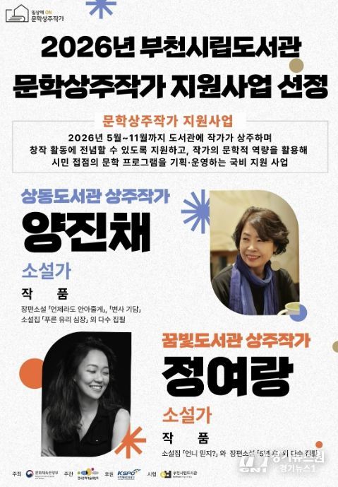 [경기뉴스원/경기뉴스1] | 부천시립상동도서관과 꿈빛도서관은 문화체육관광부가 주관하고 한국문화예술위원회가 주최하는 ‘2026년 도서관 상주작가 지원사업’ 공모에 선정돼 5월부터 시민 대상 문학 프로그램을 운영한다.