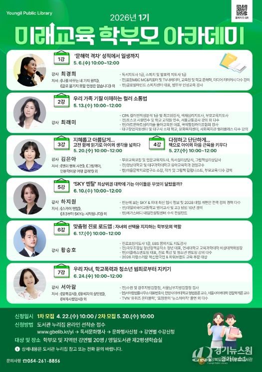 [경기뉴스원/경기뉴스1] | 경상북도교육청 영일도서관은 오는 5월 6일부터 학부모 및 지역주민을 대상으로 ‘2026 1기 미래교육 학부모 아카데미’를 운영하고 수강생을 모집한다.