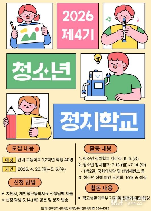 [경기뉴스원/경기뉴스1] | 광주시교육청은 청소년의 정치참여 역량을 키우기 위해 ‘제4기 청소년 정치학교’ 참가자를 모집한다.
