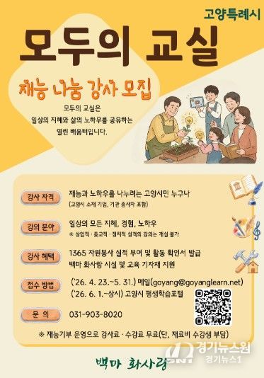 [경기뉴스원/경기뉴스1] | 고양특례시가 올해 시민의 재능을 지역의 배움으로 연결하는 백마 화사랑 ‘모두의 교실’을 운영하며, 재능을 기부할 시민 강사를 상시 모집한다고 23일 밝혔다.