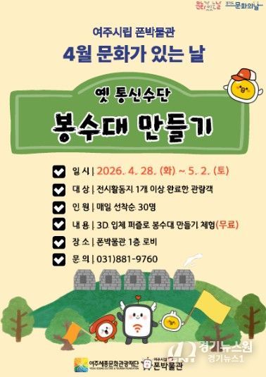 [경기뉴스원/경기뉴스1] | 여주세종문화관광재단이 운영하는 여주시립 폰박물관은 4월 '문화가 있는 날'을 맞아 오는 4월 28일부터 5월 2일까지 시민 참여형 체험 행사 '소식을 전하던 봉수대 만들기'를 운영한다.